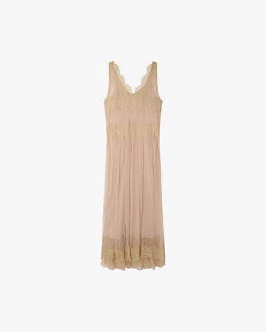 Mes DemoisellesLONG LACE DRESS – PINK BEIGE A flowing dress in delicate pink chiffon viscose, subtly sheer, adorned with bands of inset pinkish-beige lace. The in...