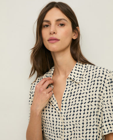 Geometric-print shirt in white and navy-blue. Regular fit. EcoVero™ viscose crepe. Collar. Short puffed sleeves. Button front. Pleats in back. Side...
