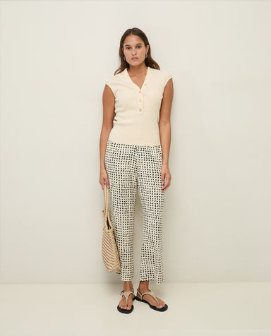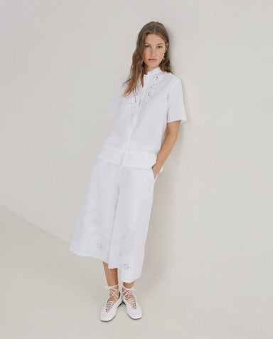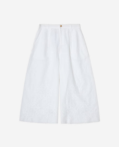 White skirt trousers. Cotton-linen blend. Mid rise, cropped fit. Lining. Side pockets and front zip and button fastening. Two patch pockets in back...