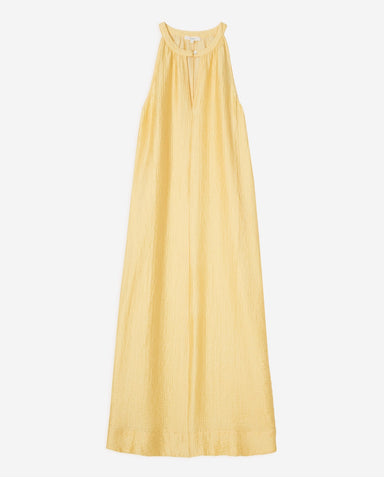 Long dress in pastel yellow. Lightweight, wrinkle-effect fabric. Regular fit. Flowy design with halter neck and teardrop opening with mother-of-pea...