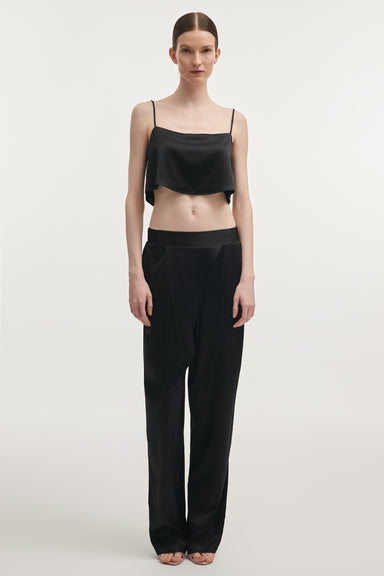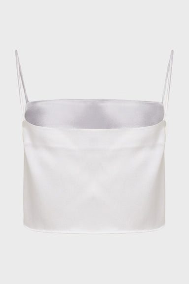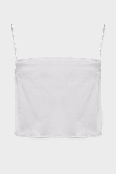 A refined silk satin crop top defined by its clean lines and fluid finish. Crafted from a soft silk blend, the silhouette is minimal and structured...