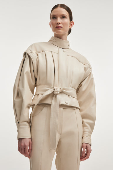 A structured leather jacket defined by bold volume and refined detailing. Crafted from supple genuine leather, the silhouette is slightly cropped w...