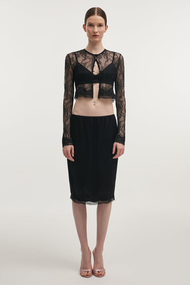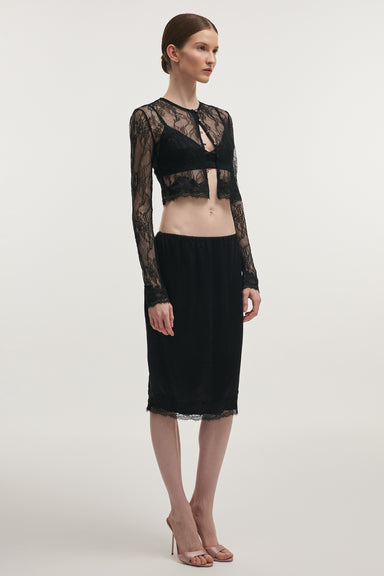 A refined lace skirt that combines delicacy with a modern, elongated silhouette. Crafted from soft lace, the design follows the body closely before...