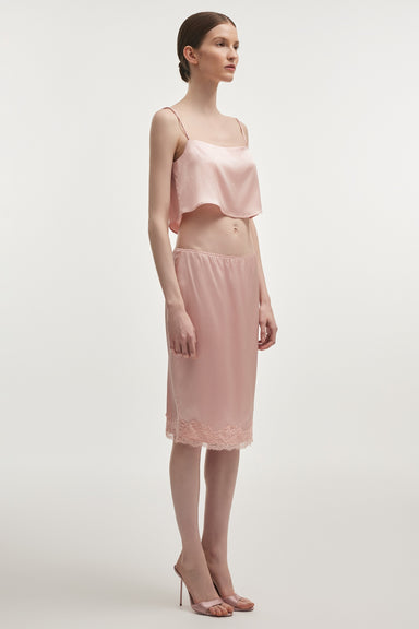 A refined silk satin skirt defined by its clean silhouette and delicate detailing. Crafted from a soft silk blend, the design follows the body clos...