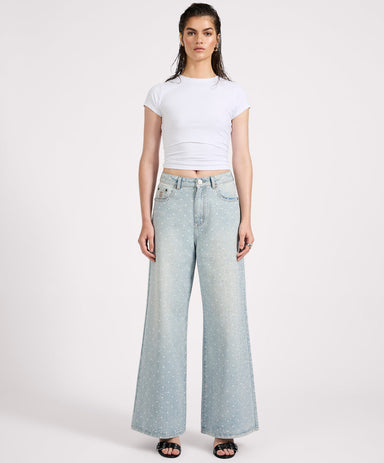 The BLUE SPARKLE LOVE MACHINES are made to shine — literally. With a mid waist rise and a bold super wide leg, they channel that ‘70s disco silhoue...