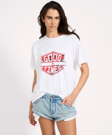 Laid-back and loud in the best way. The WHITE GOOD TIMES BOYFRIEND TEE brings retro energy with a bold red graphic print on a crisp white base. Sli...