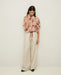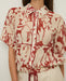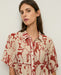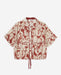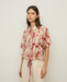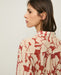Red floral-print blouse. Viscose gauze. Oversized cut. Collar. Short sleeves. Mother-of-pearl buttons in front. Flowy design with drawstring waist. Contrasting trim. Two front pockets with buttons. Pleat in back. Length from shoulder: 55 cm (size S).