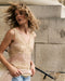 A flowing dress in delicate pink chiffon viscose, subtly sheer, adorned with bands of inset pinkish-beige lace. The interplay of textures creates an airy and romantic look, while the separate silky modal lining ensures comfort and opacity. Its long, straight cut highlights the fabric's lightness, and the V-neckline at the front and back adds a sensual and feminine touch. An elegant and timeless piece that will flatter your figure.