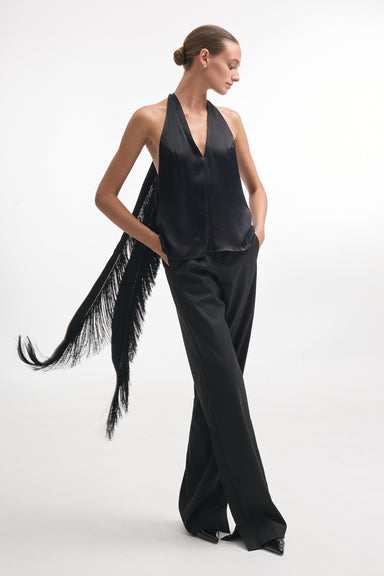 Satin halter top with an open back and statement fringe details. A sleek and modern piece that adds movement and elegance to your look, perfect for...