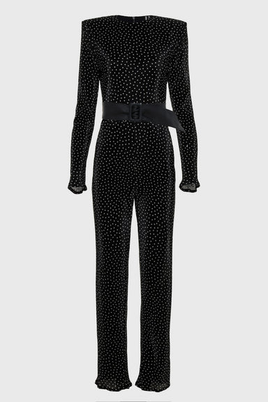 A tailored jumpsuit in pleated satin with a subtle polka-dot pattern. Defined by strong shoulders and a fitted waist, it creates a sculptural yet f...