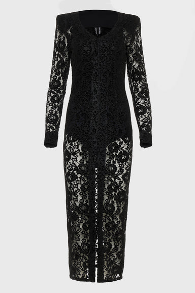 A refined evening silhouette cut in sheer lace velvet, designed to trace the body with ease and intention. The dress features a clean, structured u...