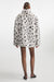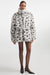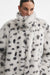 A plush faux fur coat with a clean, modern line. White base, scattered black markings, a subtle yet playful print.