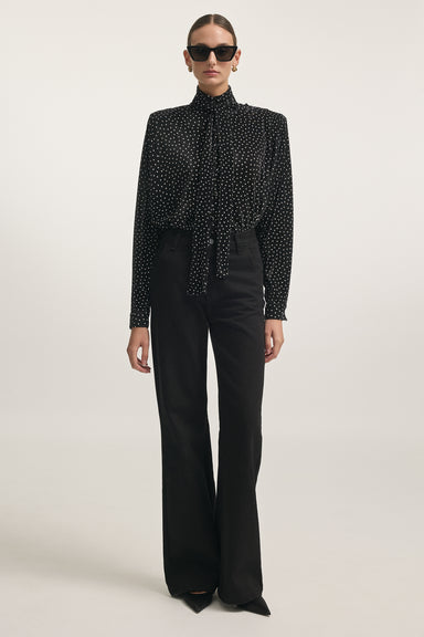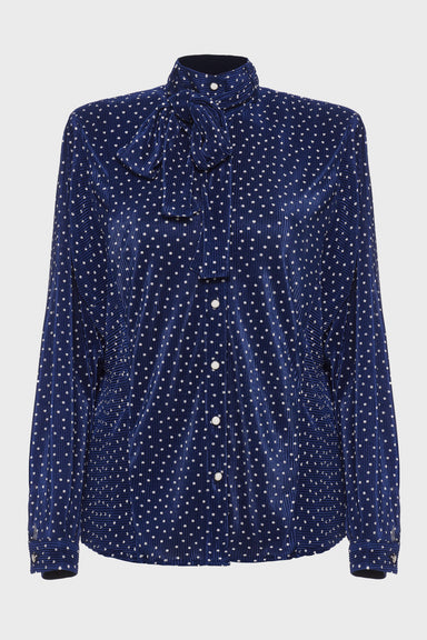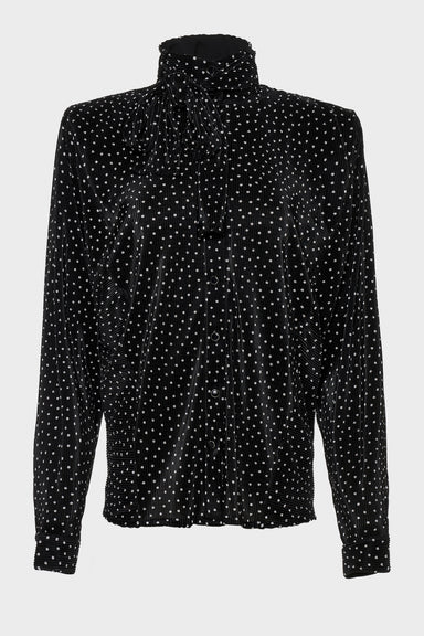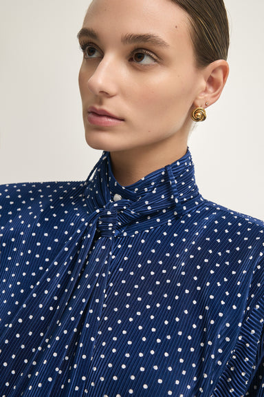 A refined blouse crafted from pleated satin in a subtle polka-dot design. Featuring a high neckline and soft drape, it combines sophistication with...