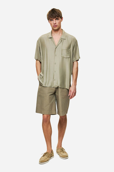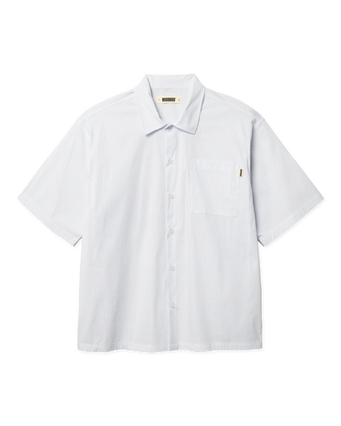 Loose fit short sleeve shirt with a relaxed, boxy silhouette. Features a classic collar, button front, and a single chest pocket. Subtle vertical s...