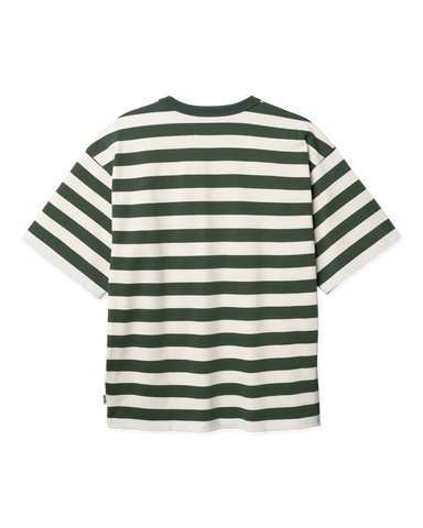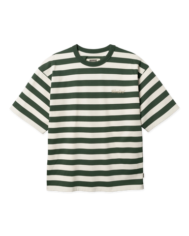 Boxy fit tee with a relaxed silhouette and a classic crew neckline. The surface features horizontal stripe patterning across the entire garment, fi...