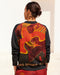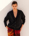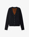 A fine-knit charcoal-colored merino wool cardigan with a sleek, feminine silhouette. The front is plain, understated, and elegant, accentuated by a V-neck and classic buttoning. On the back, a striking contrast: a jacquard viscose panel reveals a graphic, symbolic dragon motif. Long sleeves and delicate finishes create a piece that combines discretion and character.
