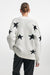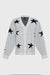 Soft grey wool-blend cardigan adorned with bold navy star motifs. A cozy yet statement piece that brings a playful twist to classic knitwear. Features a relaxed fit and button-down front for effortless layering.