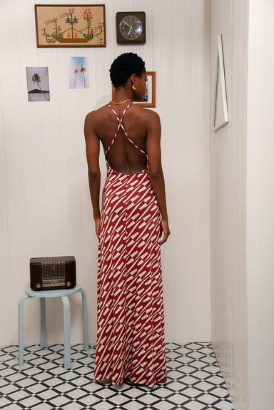 The Chutney dress is a timeless statement piece, featuring a sleek halter neckline with a bold front slit. The open-back design with delicate criss...