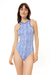 Sporty and sleek, this white & blue striped one-piece offers clean lines and a minimalist silhouette, combining comfort with timeless style. Designed to move with you, in and out of the water.