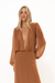 This lightweight chiffon blouse with a deep V neckline and gathered waist for a fluid, creates a feminine silhouette, with the billowing long sleeves adding an elegant touch.