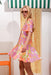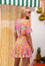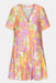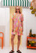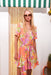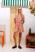 The Passion Flower dance-dress is made from soft, lightweight fabric with a bold floral print in orange, pink, and green. It features a V-neckline, short sleeves, front button closure, and a flared skirt that moves beautifully. The detachable belt lets you style it your way.